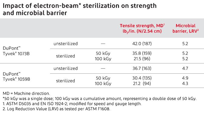Die Elektronenstrahl-Sterilisation mit einer typischen Strahlendosis von 25 kGy bis 100 kGy ist ein verbreitetes Sterilisationsverfahren für Einweg-Medizinprodukte. Einige medizinische Verpackungsmaterialien sind nicht strahlungsbeständig, so dass bei ihnen Molekülkettenspaltungen auftreten können, die deren physikalische Eigenschaften deutlich verschlechtern. Nicht so bei DuPont™ Tyvek®.