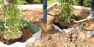 Schneiden Sie Ihre Pflanze zu und füllen Sie das Loch mit Erde auf, bis 2 cm der Plantex® Wurzelsperre über die Oberfläche hinausragen.