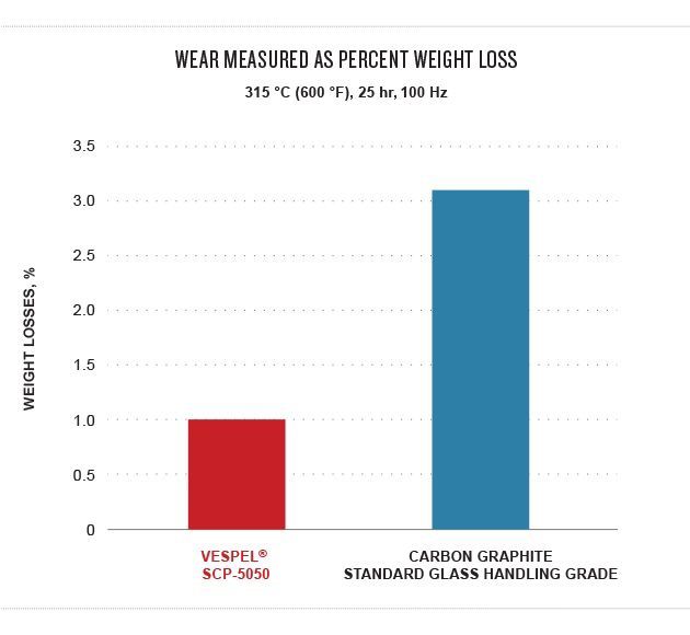 DuPont™ Vespel® SCP-5050 parts are based on a proprietary polymer and represents a product innovation for the glass industry. Test results show 3 times less wear versus carbon graphite at 315°C (600°F) oscillatory conditions. Glass bottle plants have reported Vespel® SCP-5050 components to have a 2 to 11 times longer life over carbon graphite components. This translates into significantly higher life of consumables to increase production efficiency. In addition, Vespel® SCP-5050 components have a very low thermal conductivity, virtually no oil absorption and increased impact resistance which makes them ideal for sweep-out finger and stacker bar insert applications.